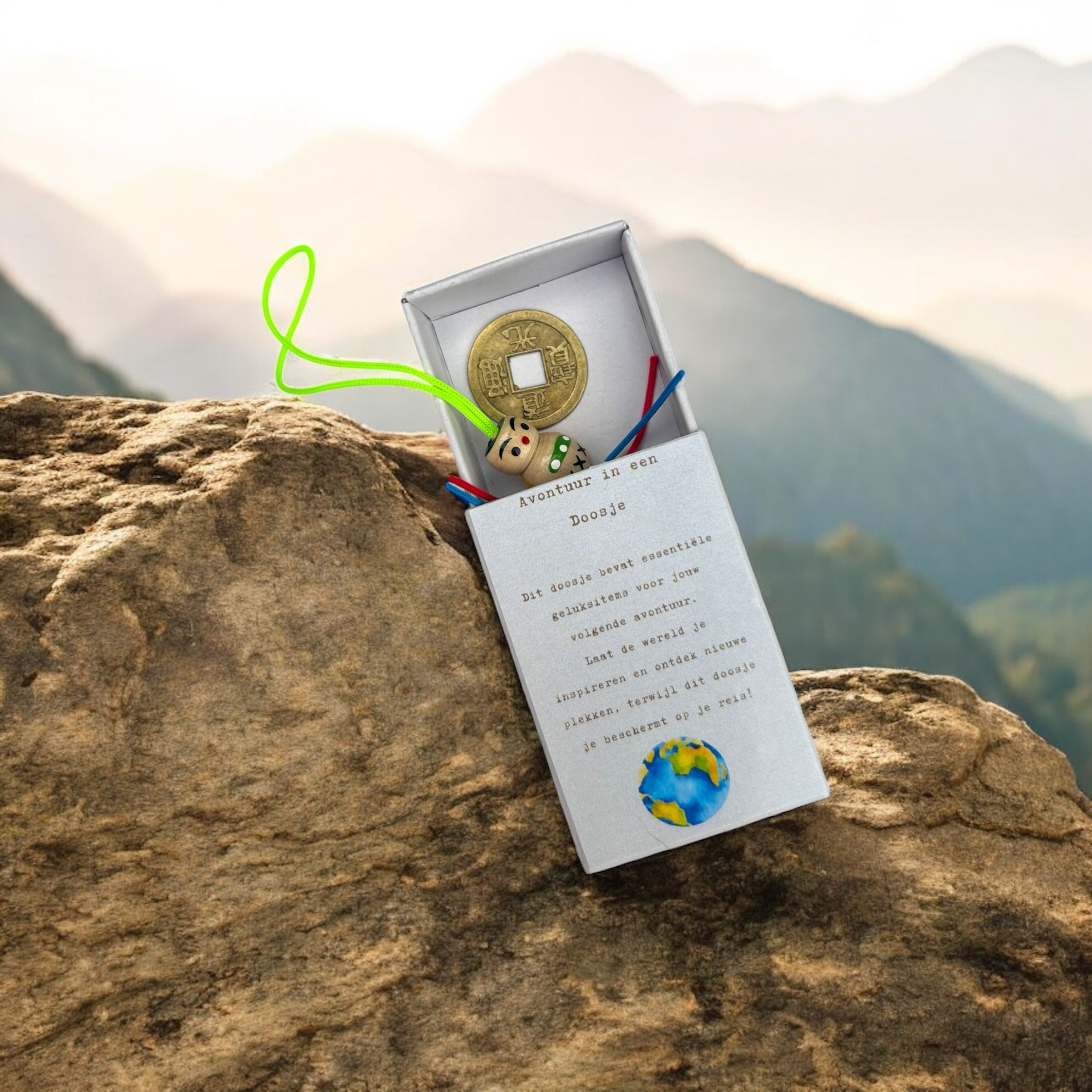Neem het "Avontuur in Doosje" mee op je volgende reis en laat de magie van geluk en bescherming je begeleiden!