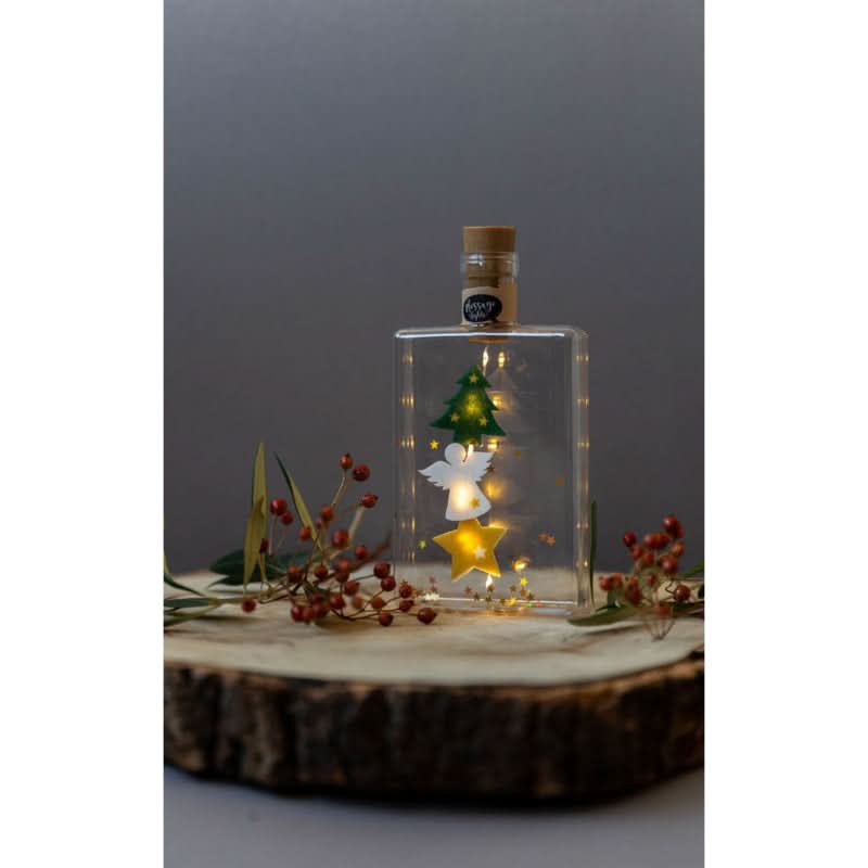 Flesje met lampjes en vilten figuurtjes in kerst thema.