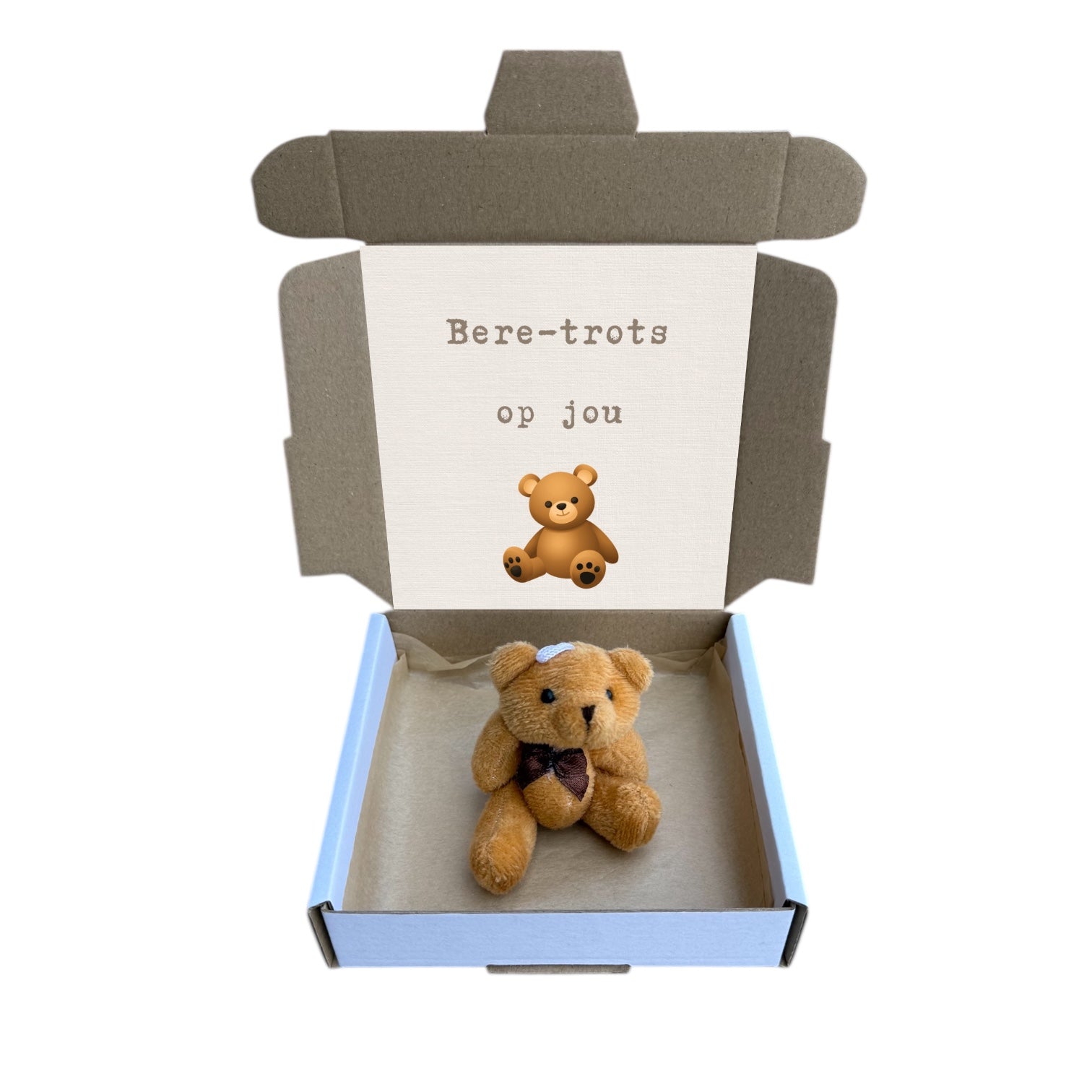 Verras de geslaagde met een uniek brievenbusdoosje van 12x12 cm, speciaal ontworpen om je trots te tonen! Dit schattige doosje bevat een lief wit of bruin beertje dat symbool staat voor de prestatie en doorzettingsvermogen van de ontvanger. Met de boodschap "Bere-trots op jou" laat je zien hoe blij je bent met hun succes. Perfect om op een verrassende manier je felicitaties over te brengen, dit brievenbusdoosje past door de brievenbus en zorgt voor een glimlach op het gezicht van de geslaagde. Een klein gebaar met een grote impact!