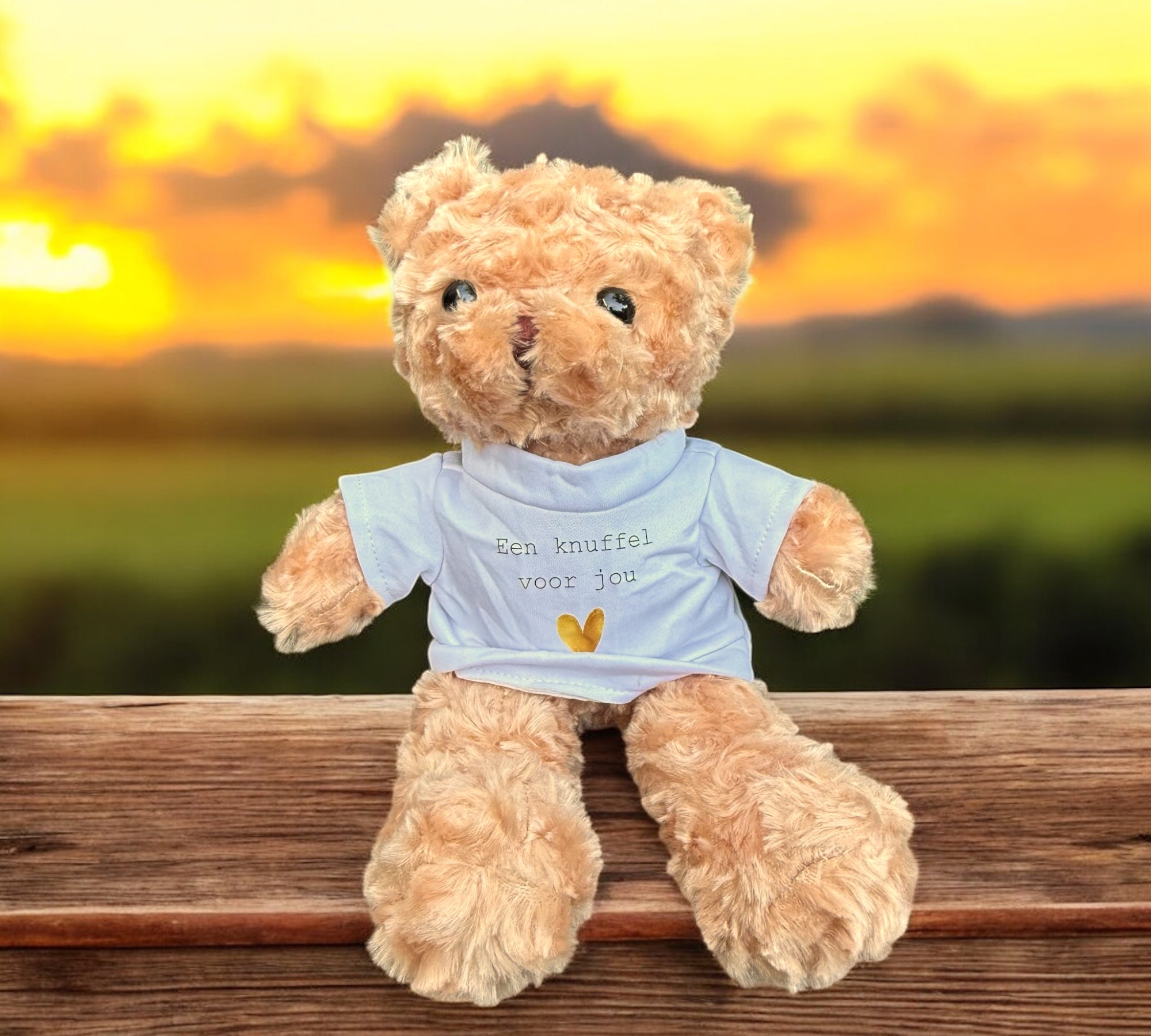 Ontmoet onze lieve knuffelbeer van ongeveer 12 cm hoog, helemaal klaar om jouw nieuwe beste vriend te worden! Deze zachte, knuffelbare beer draagt een schattig t-shirt met de tekst **"Knuffel voor jou"** – een warme boodschap die perfect is om iemand te laten weten dat ze een dikke knuffel verdienen.