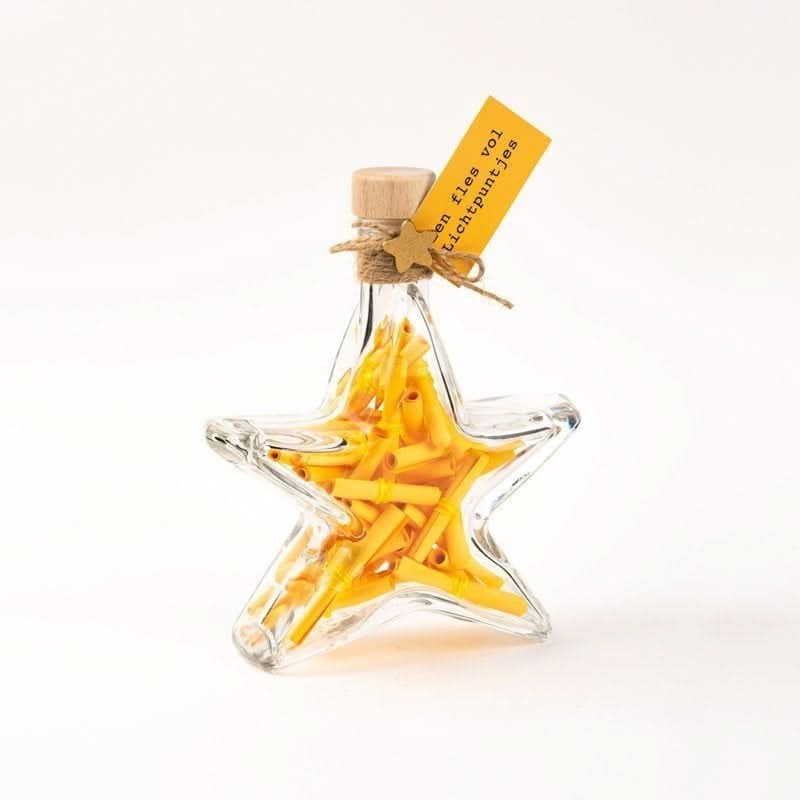Een mooie grote fles in de vorm van een ster met opgerolde briefjes met 36 verschillende zinnen.