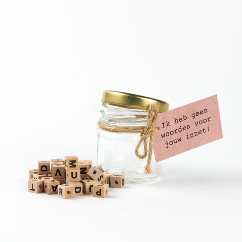 Potje gevuld met houten letter kralen