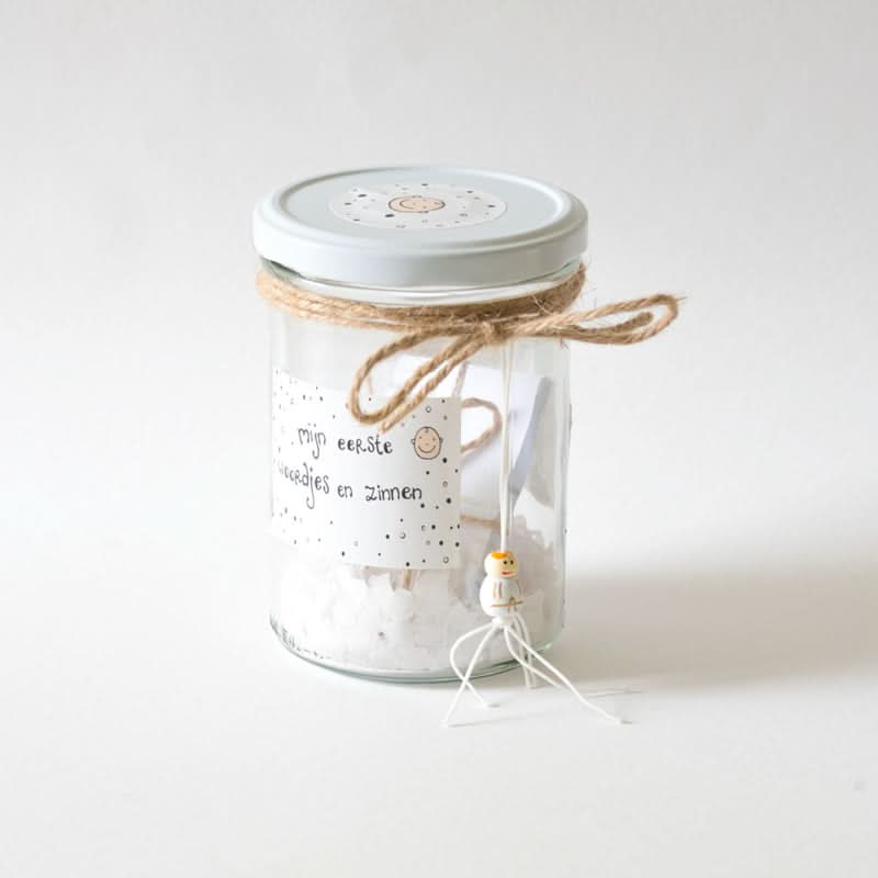 Schrijf de eerste of leukste woordjes/zinnetjes op, en bewaar de kaartjes voor altijd in deze mooie pot.