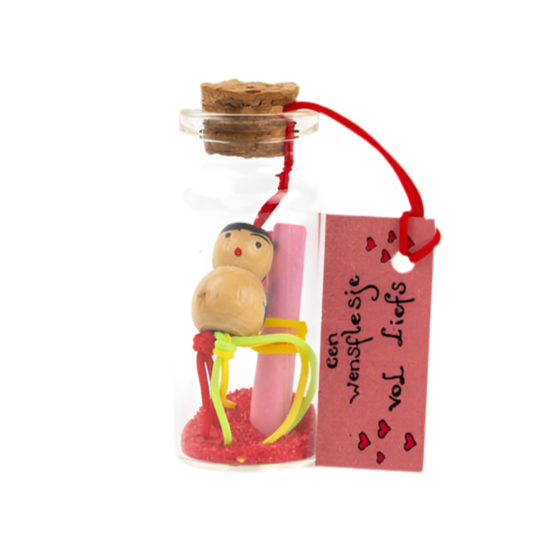 Dit handgemaakte glazen wensflesje (5x2 cm) is een uniek en betekenisvol cadeau, perfect om op te sturen als brievenbuscadeau. In het flesje vind je een schattig gelukspoppetje, dat symbool staat voor goede wensen en positieve energie.